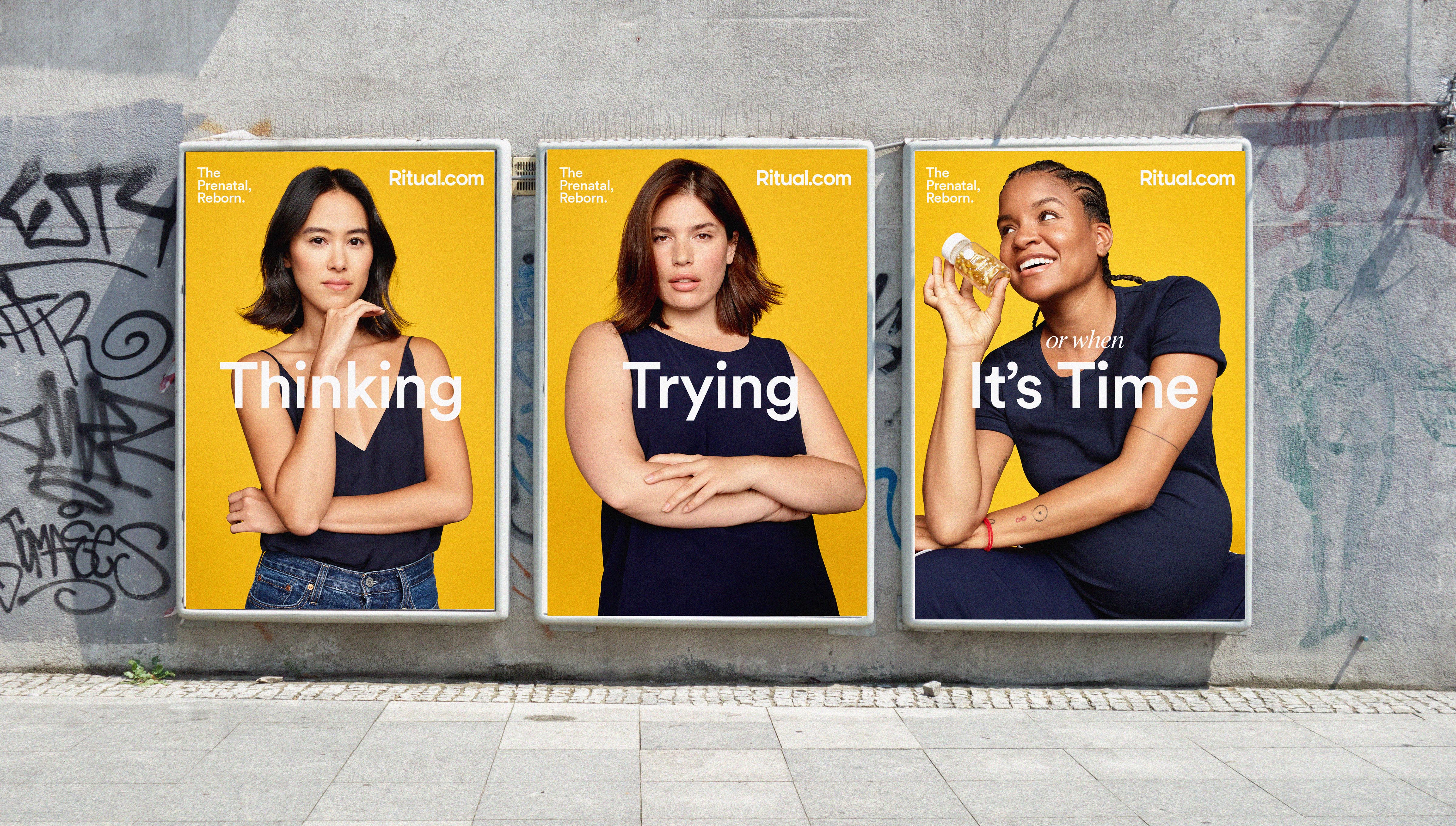 Having originally built Ritual's brand and positioning the first product at launch, I visited the team to help lead how this next chapter would evolve. First, I dug into the strategy and 'why' with Head of Brand Marketing, Claire Knebl. We unlocked how to position the product and consulted the scientific team on what women needed to know: Which is that prenatals aren't just for when you're pregnant (they're very important for preparing), and that this product is truly next-generation. I proceeded to lead campaign concepting and messaging alongside copywriter Crissy Milazzo, and built the big messages: This is 'The Prenatal, Reborn' and 'For Thinking, Trying and When It's Time'. I then casted the production with real women's stories and executed a full photo and video production alongside Mosspark to capture assets necessary to bring the campaign, brand extension, website, ads and more to life.